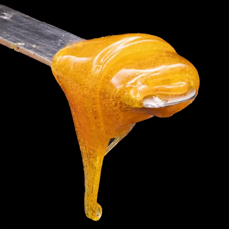 Figure 3 – Live Rosin shot taken at EarthWolf farms. This photo is taken when the live rosin is warm, when cooled, it does become brittle if it contains other minor cannabinoids. Live Rosin is always recommended to be dabbed at room temperature.