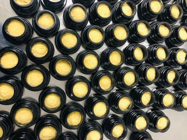Figure 2. Pictured above is God’s Space Needle Bubble Hash, a collection of trichomes that were mechanically separated using an ice and water extraction chamber, followed by being freeze-dried then packaged in glass jars for distribution.
