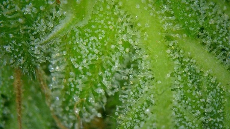 Figure 1. a. Trichome macro of a plant at EarthWolf Farms. You can see the trichome heads, and these are the factories producing and storing cannabinoids. The stalks also play an important role in trichome production and contain cannabinoids and terpenoids, however at a much lower concentration than the trichome heads. b. a collection of trichomes which when pressed will feel very sticky.